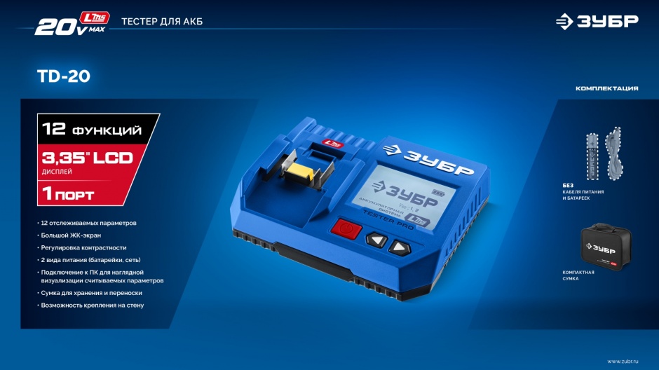 Зарядное устройство для LMS АКБ 20 В, 1 порт Зубр БЗУ-20-1