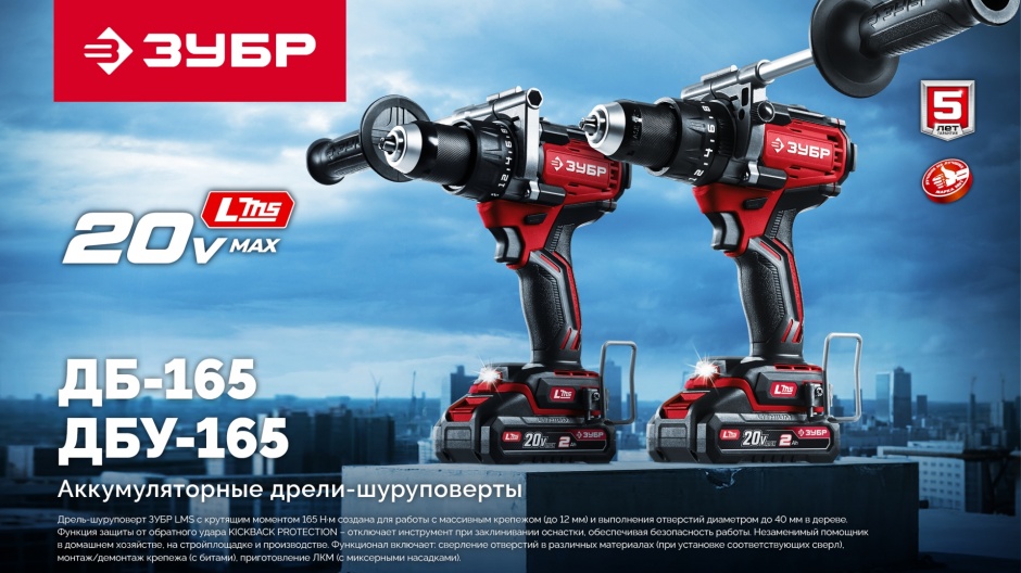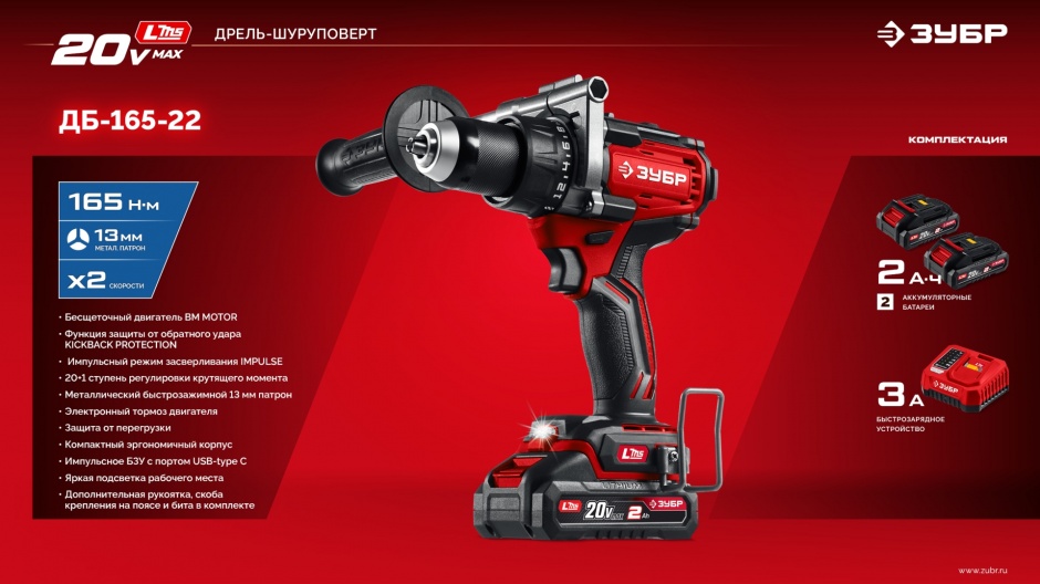 Бесщеточная дрель-шуруповерт ЗУБР системы LMS с максимальным крутящим моментом 165 Нм предназначена для работы с самым крупным крепежом (саморезы до 12 мм диаметром) и сверления отверстий до 40 мм в дереве. Встроенная защита от обратного удара предотвращает повреждение кисти при резкой блокировке вала. Комплектация с двумя аккумуляторами позволяет работать практически без остановки