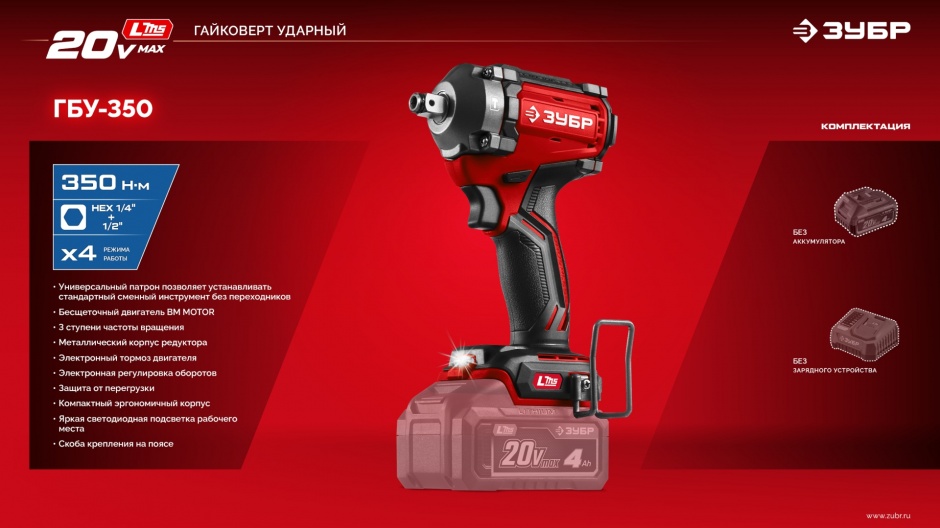 Бесщеточный ударный гайковерт ЗУБР системы LMS с максимальным крутящим моментом 350 Нм предназначен для фиксации резьбовых соединений размером до М18. Ударная функция с тангенциальным направлением удара обеспечивает эффективное заворачивание без реактивного момента на кисть оператора