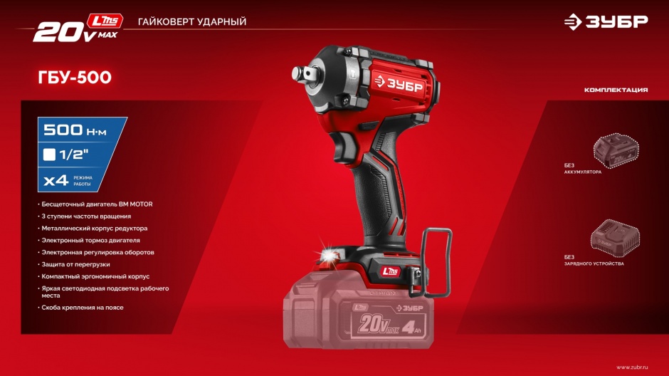 Бесщеточный ударный гайковерт ЗУБР системы LMS с максимальным крутящим моментом 500 Нм предназначен для фиксации резьбовых соединений размером до М22. Ударная функция с тангенциальным направлением удара обеспечивает эффективное заворачивание без реактивного момента на кисть оператора