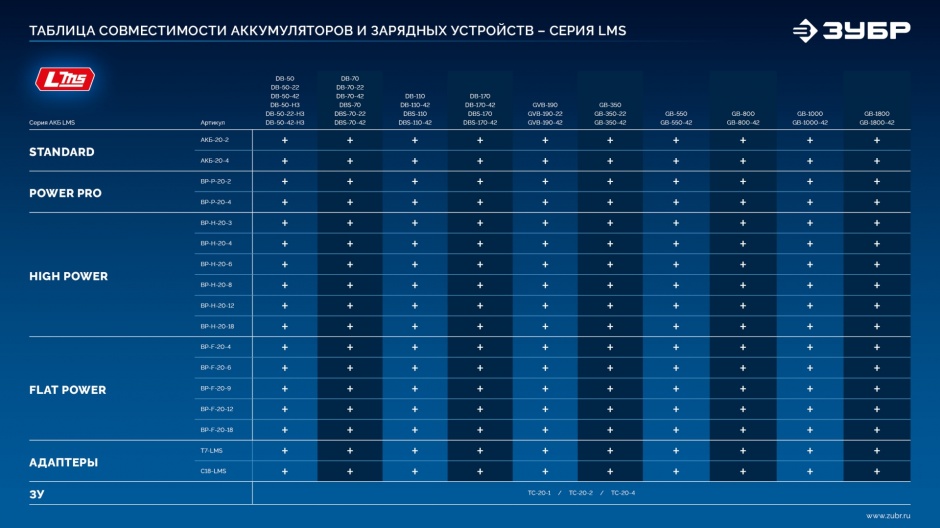 Источник питания для инструмента ЗУБР Професссионал системы LMS позволит Вам работать дольше и производительнее. Качественные элементы INR-18650 с усовершенствованной технологией обеспечивают повышенные удельные характеристики и длительный срок службы