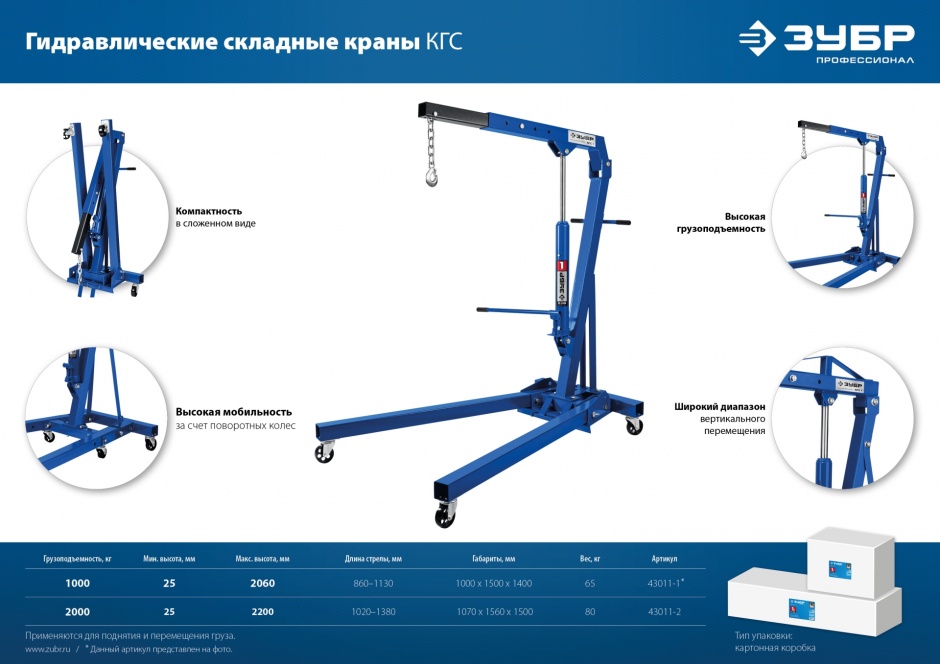 Автономное устройство для поднятия и перемещения груза, не требующее дополнительных приспособлений. В основном используются в авторемонтных мастерских, на станциях техобслуживания для извлечения и перемещения внутри помещения ДВС и других крупных деталей автомобилей.
