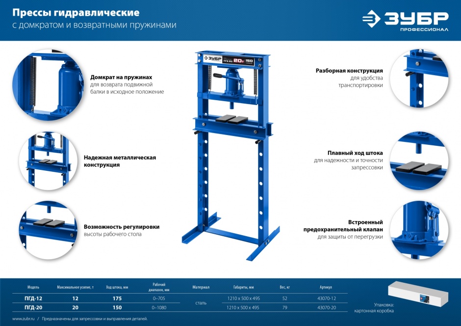 Пресс ЗУБР - мощный инструмент для запрессовки деталей. Отличается прочной металлической конструкцией. Широкое Н-образное основание надежно крепится к полу анкерными болтами. Силовым элементом пресса является домкрат, который при работе опускает подъемную платформу и запрессовывает деталь