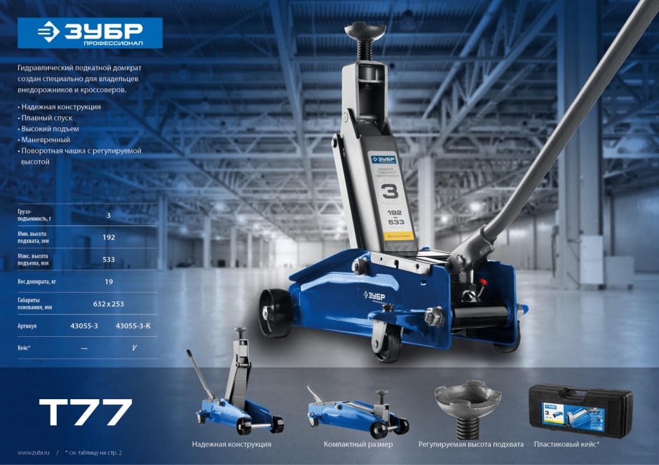 Домкрат отлично подходит как для легковых автомобилей так и для внедорожников и кроссоверов, благодаря высокой грузоподъемности и дополнительной проставки для работ с высокими и тяжелыми автомобилями.
