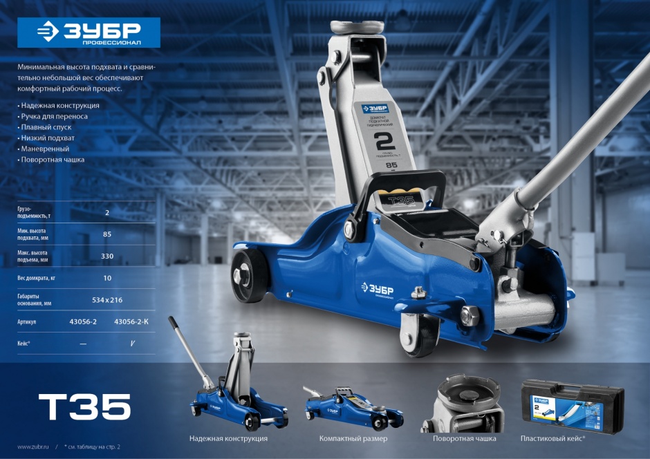 Низкая высота подхвата, высокая грузоподъемность и небольшой вес домкрата делают его одним из лидеров на рынке подкатных домкратов. Удобно работать в ограниченном пространстве бокса или гаража. Подходит для работы с ″низкими″ автомобилями с небольшим клиренсом.