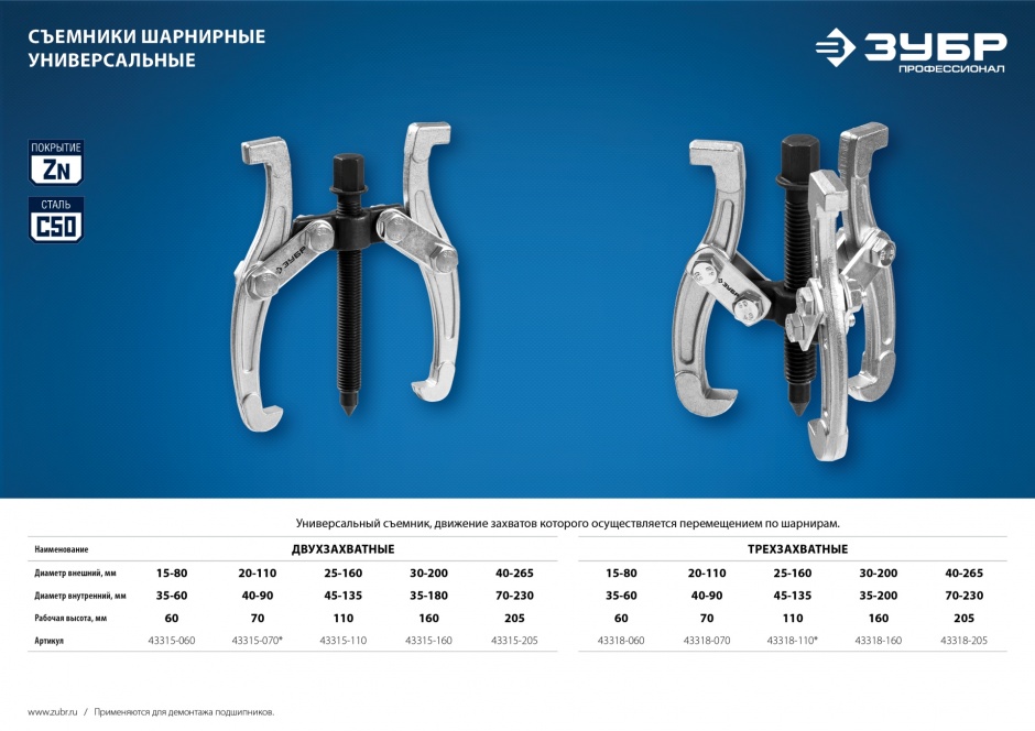 Захваты съемника выкованы из качественной инструментальной стали, что обеспечивает долгий срок службы при работе с высокими нагрузками. Позволяет работать с широким рядом узлов