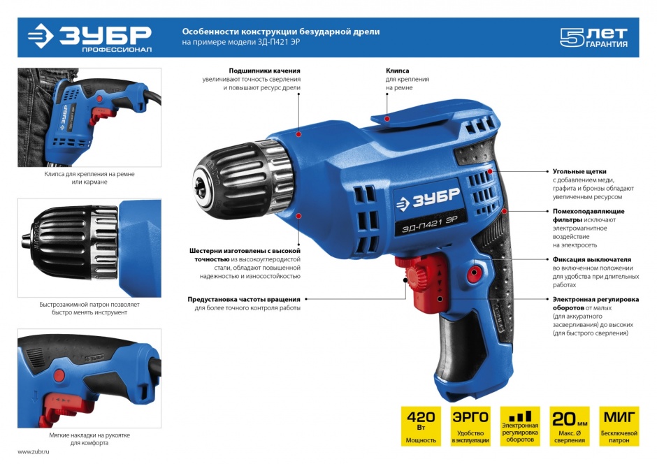 - Электронная регулировка оборотов от малых (для аккуратного засверливания) до высоких (для быстрого сверления)