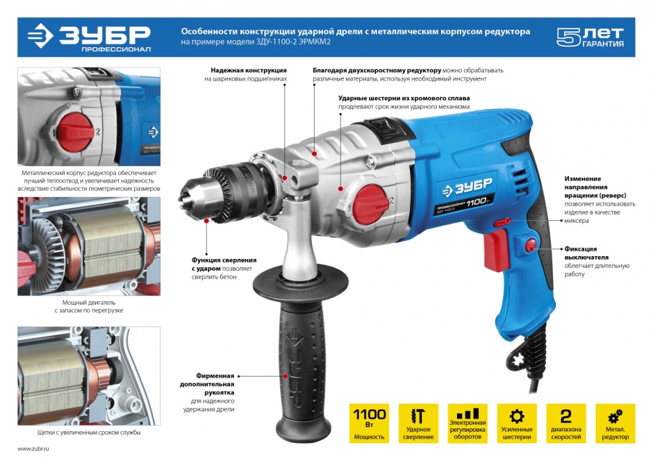 - Благодаря двухскоростному редуктору с широким диапазоном скоростей изделие может выполнять большой спектр задач: сверление, заворачивание, перемешивание, шлифование и т.д.