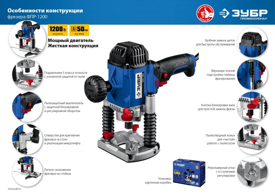 Фрезер ЗУБР серии Профессионал – многофункциональное изделие для всех видов фрезерования (продольного, фигурного, по шаблону, по радиусу) различных материалов. Мощный двигатель и максимальная глубина погружения 50 мм обеспечивают эффективную и производительную работу. Удобная эргономика и бОльшая маневренность благодаря удлиненной основной рукоятке способствуют удобству при работе