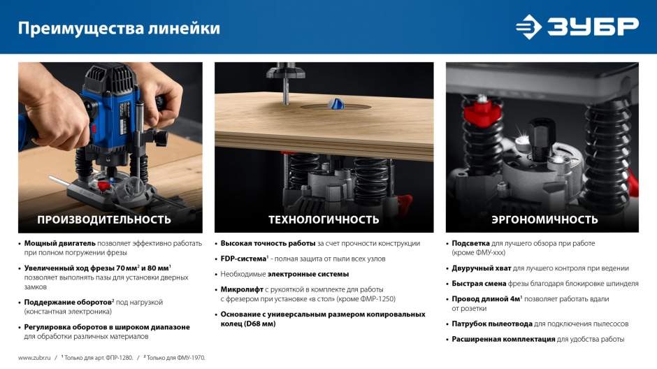 - Увеличенный рабочий ход фрезы 70 мм и возможность использования полного хода для фрез диаметром до 68 мм