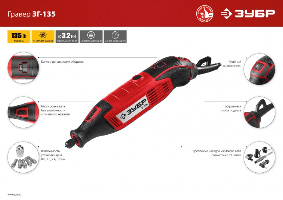Гравер ЗУБР - универсальное устройство для широкого спектра работ (резка, сверление, полирование, гравирование, шлифование). Регулировка оборотов в большом диапазоне и различные диаметры устанавливаемых цанг позволяют выполнять разные работы. ЗУБР - реализуя Ваши мечты