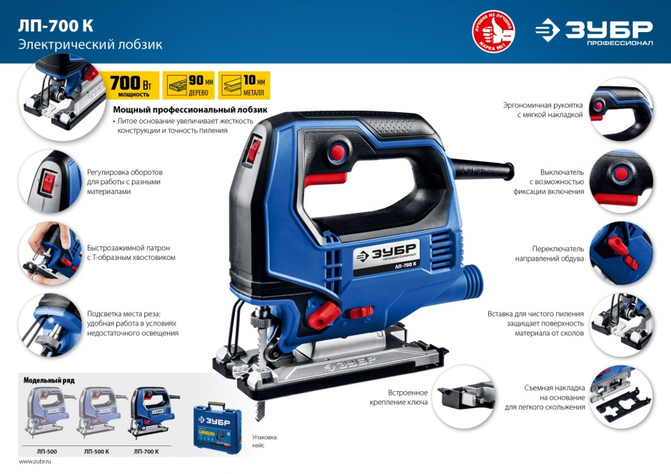 Профессиональный инструмент для всех видов пиления (прямого, наклонного, криволинейного) различных материалов (дерева, фанеры, пластика, металла) от тонких листов до брусков толщиной 90 мм. Компактный и мощный, с удобным хватом и отличной маневренностью. Полезные ″мелочи″ вроде вставки для чистого пиления, легко скользящей накладки на основание, встроенного крепления ключа и переключения направлений обдува помогают работать комфортно и эффективно