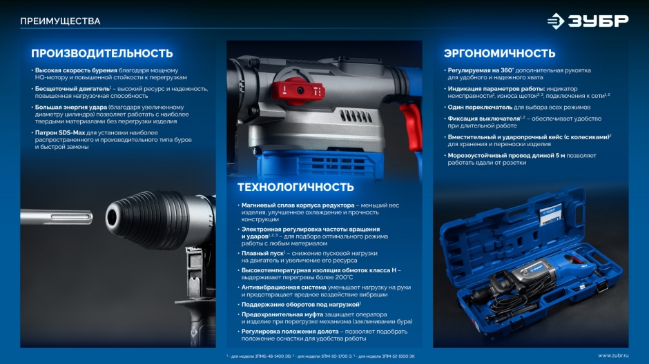 Наиболее мощный инструмент для бурения отверстий, а также ударного долбления. Создан для длительной, производительной и комфортной работы: большая сила удара, небольшой вес, регулировка частоты вращения и удара. Все, что есть для безопасности, надежности и удобства - в профессиональной линейке перфораторов ЗУБР