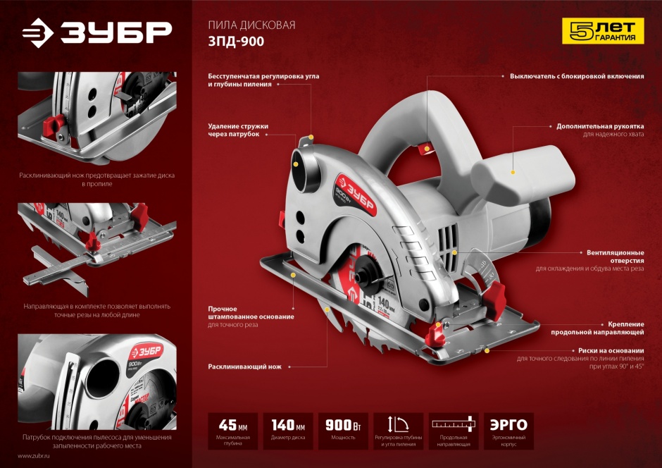- Бесступенчатая регулировка глубины и угла пиления для точных работ
