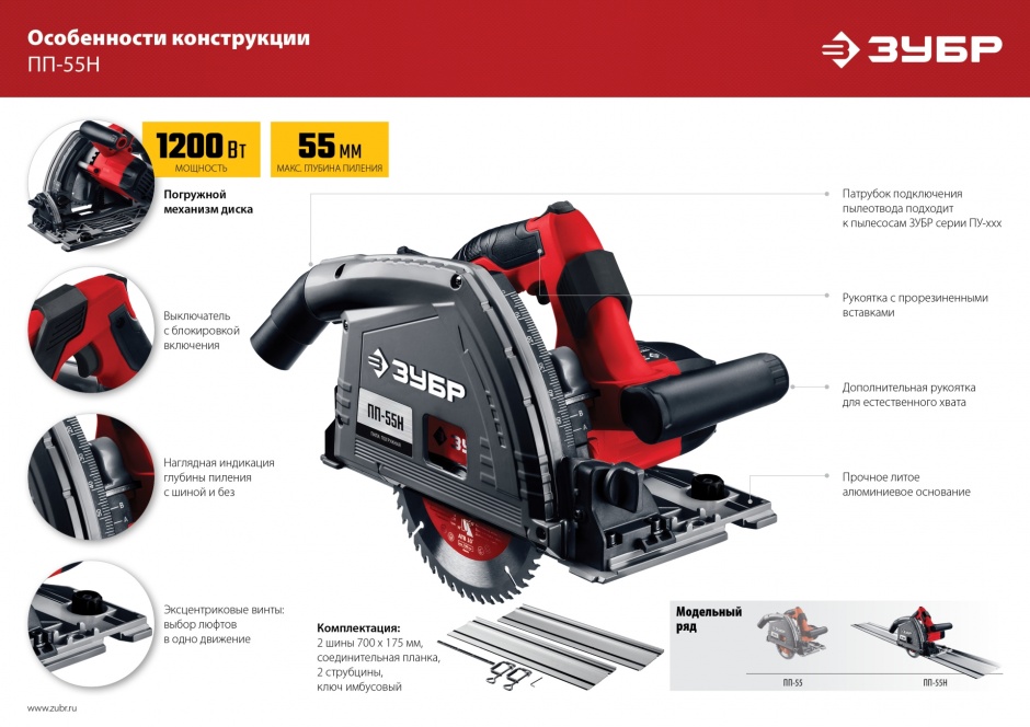Изделие для работ, требующих повышенной точности распила. Система погружения позволяет начать пиление в любой точке заготовки, благодаря чему можно выпиливать внутренние вырезы (например, под мойку или встраиваемую технику). Основание с соответствующим пазом позволяет использовать направляющую шину, что делает качественное пиление простым. Шина в комплекте существенно увеличивает точность пиления при длинных распилах