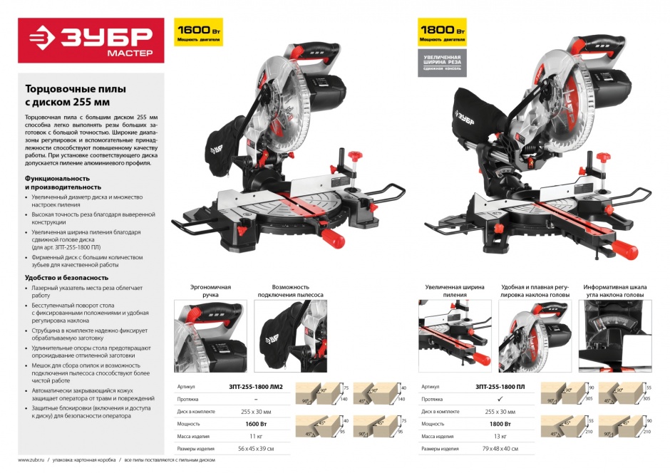 Мощный инструмент с подвижной головой и лазерной подсветкой линии реза позволяет точно разрезать древесину, пластик и тонкостенный алюминий (при установке соответствующих дисков). Пила ЗУБР - достойный выбор и отличный помощник в работе
