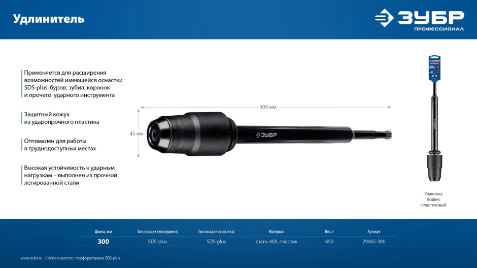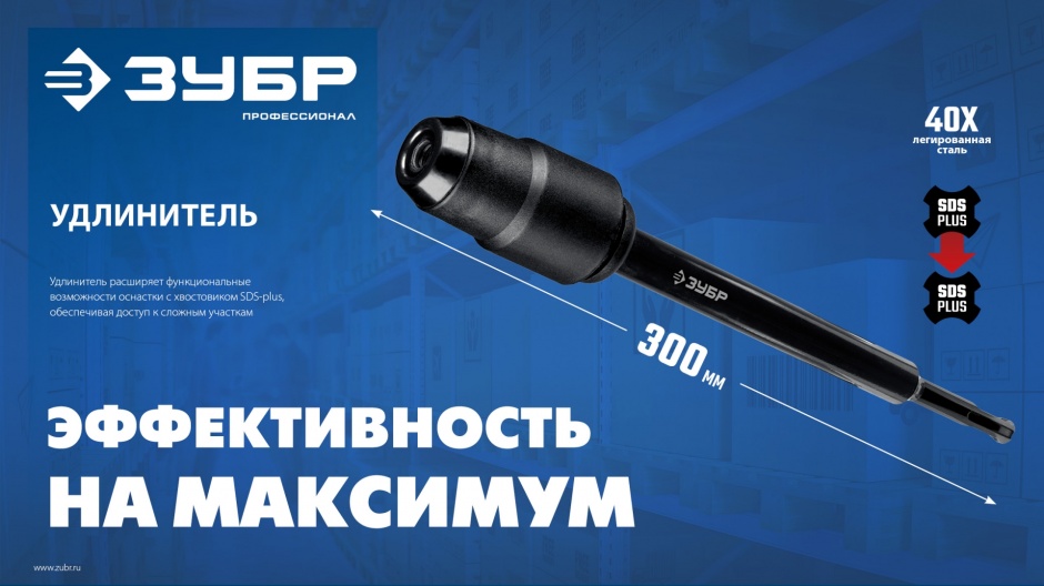 Удлинитель ЗУБР расширяет возможности вашей оснастки SDS-plus - работа в труднодоступных местах и на большую глубину.