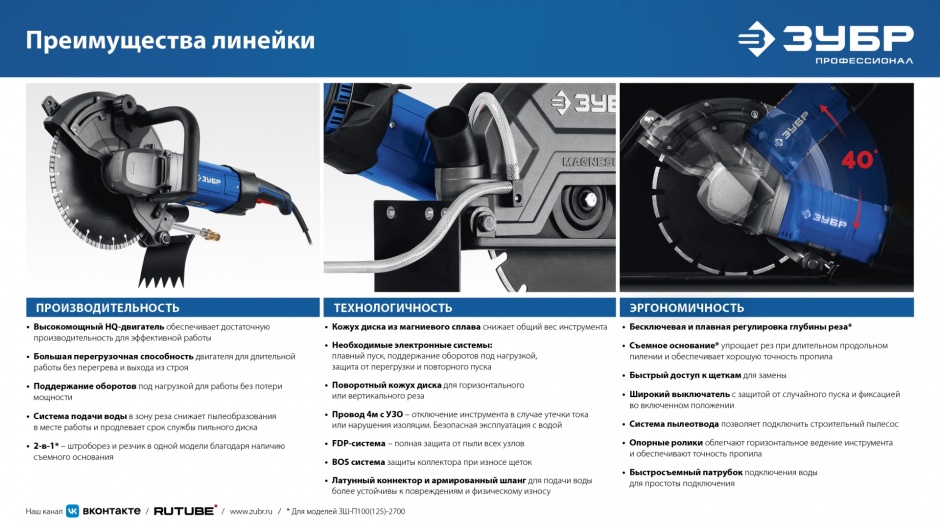 - Возможность работы с подачей воды к месту реза улучшает режим работы диска и уменьшает образование пыли