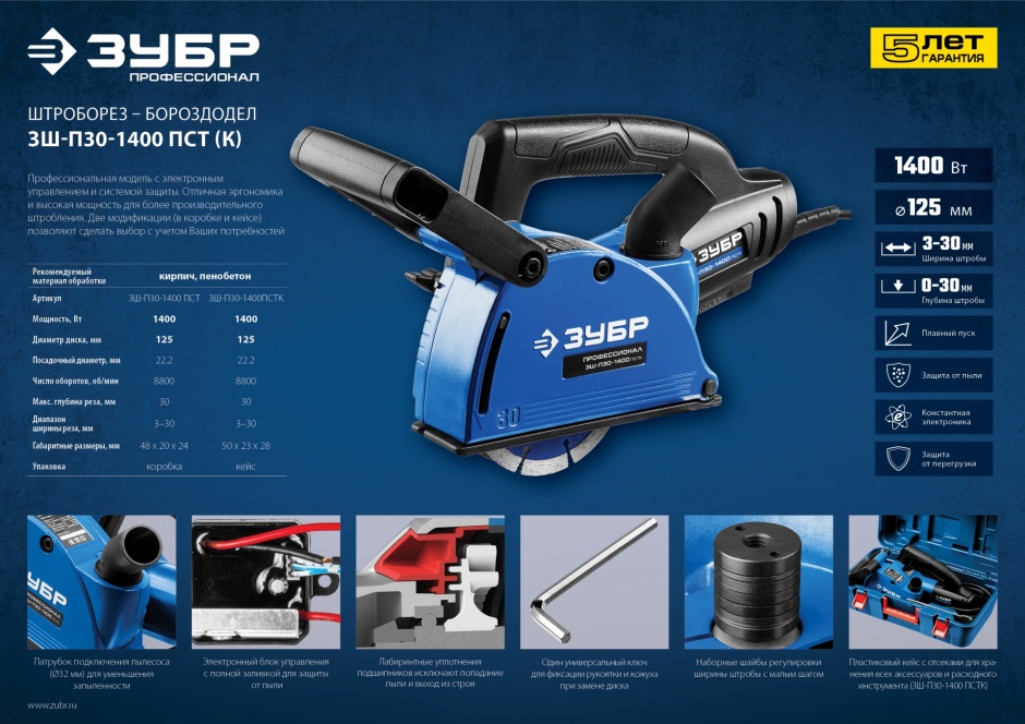 Профессиональный штроборез ЗУБР для выполнения штроб глубиной до 30 мм в легких и средних бетонах. Расширенная (по сравнению с ЗШ-П30-1400 ПСТ) комплектация включает удобный кейс для хранения и переноски. Легкость и компактность позволяют длительно держать его на весу при работе на вертикальных поверхностях