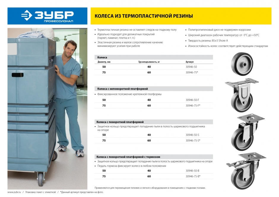 - Идеально подходят для применения внутри помещений на гладких полах. Эластичная резина и малое сопротивление качению требуют приложения минимальных усилий при работе.