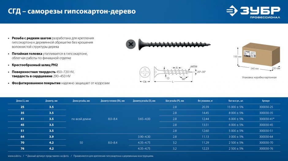 - Резьба с редким шагом разработана для крепления гипсокартона к деревянной обрешетке без крошения волокнистой структуры дерева.