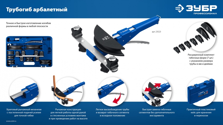 Трубогибы разработаны в соответствии с высокими требованиями профессионалов и помогают обеспечивать комфортную и эффективную работу. Используется при монтаже систем водоснабжения, отопления и кондиционирования, систем подогрева пола, гидравлических систем. Применяется для высокоточной гибки труб из мягкой меди, алюминия, мягкой меди в оболочке, тонкостенной стали и нержавеющей стали под углом до 90°.