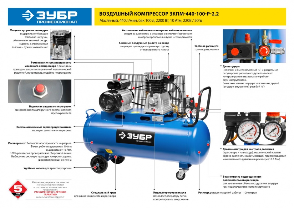- Контроль давления в ресивере и на выходе при помощи двух манометров