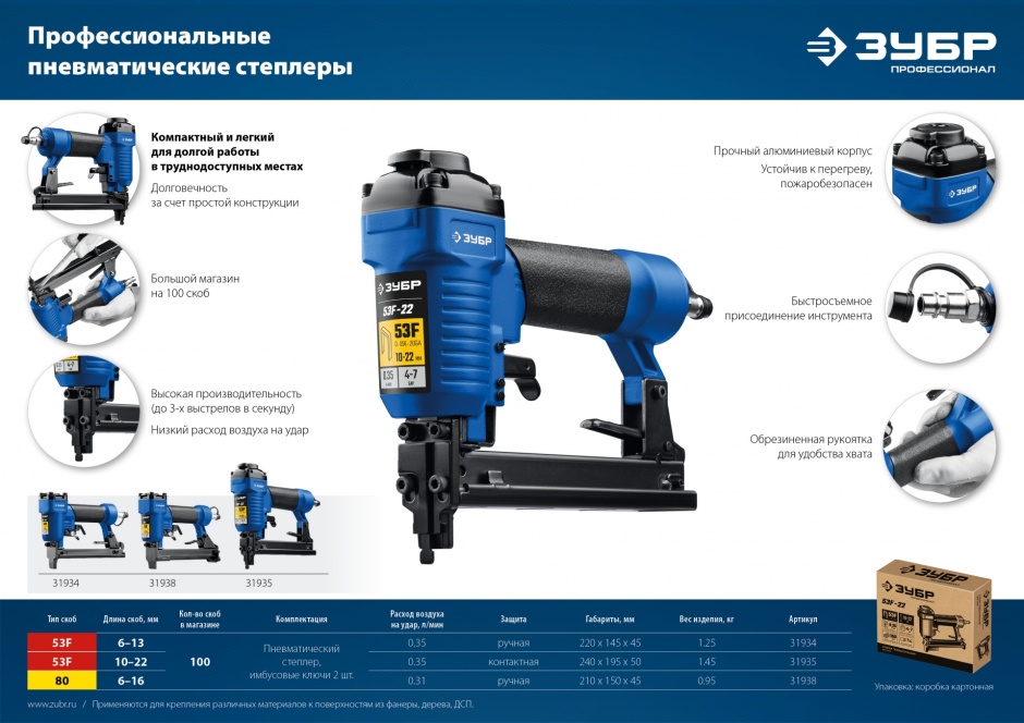 - Применяемый тип расходных материаловСкобы тип 53F (6-13 мм)