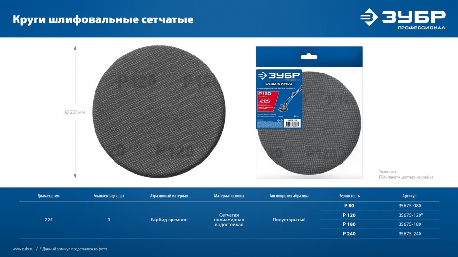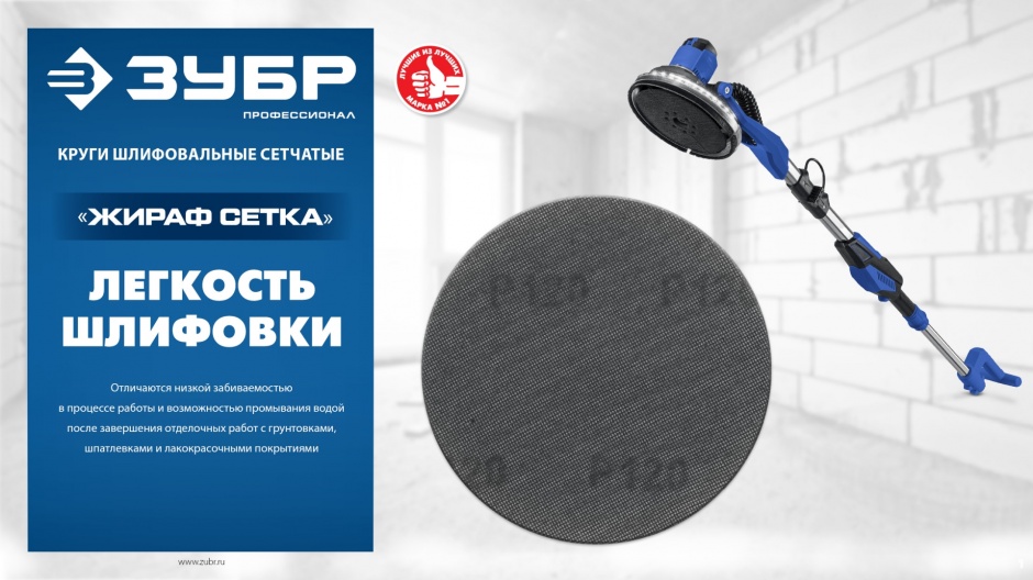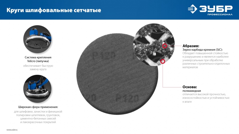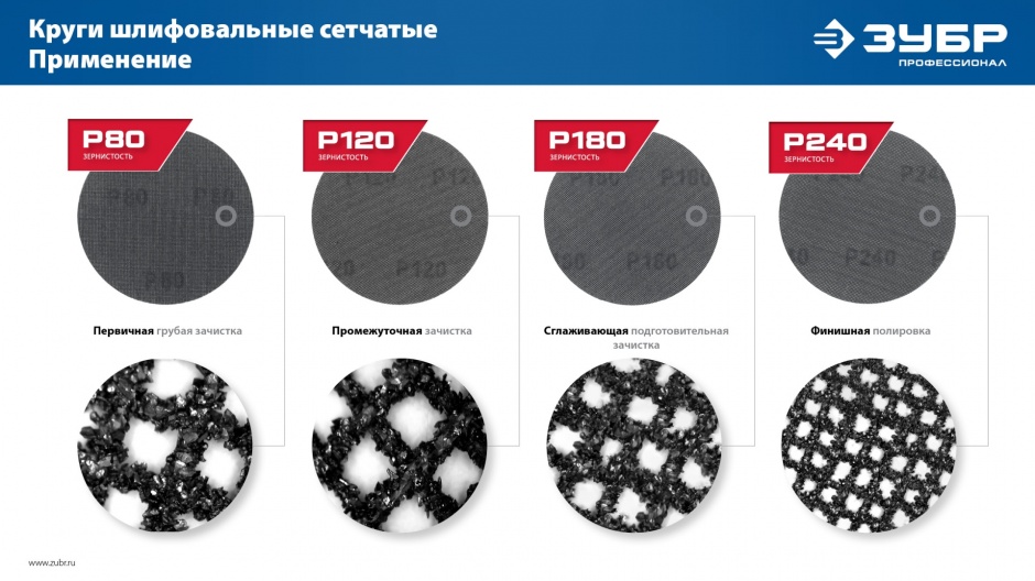 Основными преимуществами шлифовальных сетчатых кругов ЗУБР ″СЕТКА″ является их минимальаня забиваемость в процессе работы, а также уникальная возможность промывания водой по окончании отделочных работ по грунтовкам, шпатлёвкам и ЛКП.