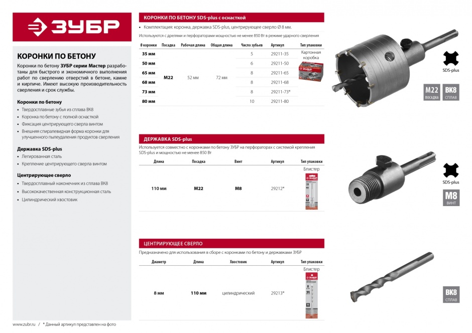 Предназначена для сверления отверстий в бетоне, кирпиче, природном и искусственном камне, а также плотных известняках. Используется с дрелями и перфораторами мощностью не менее 850 Вт в режиме ударного сверления.