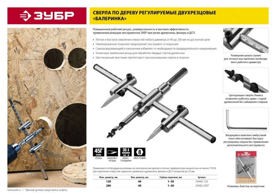 Применяется в безударном режиме на электрических дрелях и легких перфораторах мощностью не менее 750 Вт для сверления отверстий заданного диаметра древесине, фанере и ДСП толщиной до 30мм