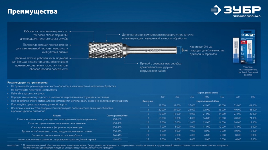 Твердосплавные борфрезы ЗУБР обеспечивают высокую производительность и могут использоваться для обработки различных материалов
