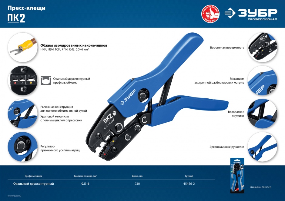 - Рычажная конструкция обеспечивает удобство в процессе обжима наконечников