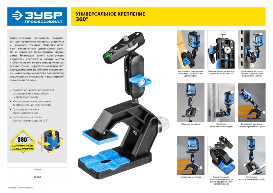 Профессиональный крепёжный элемент для лазерных устройств и цифровой техники с увеличенным диапазоном зажима. Оснащён поворотными шарнирами. Благодаря такой конструкции держатель крепится в разных местах и обеспечивает нужное направление лучей от прибора.