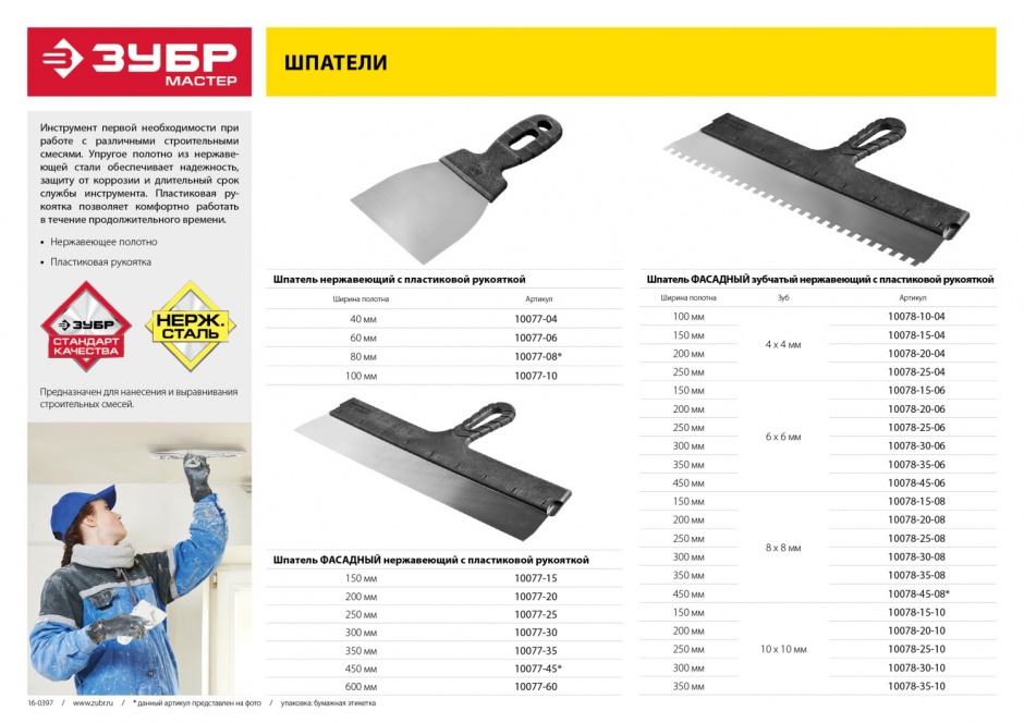 Благодаря зубчатой кромке шпатель идеально подходит для работы со строительными и клеевыми смесями, полотно из нержавеющей стали обеспечивает надежность и долгий срок службы инструмента, а удобная пластмассовая рукоятка создает условия для комфортной работы