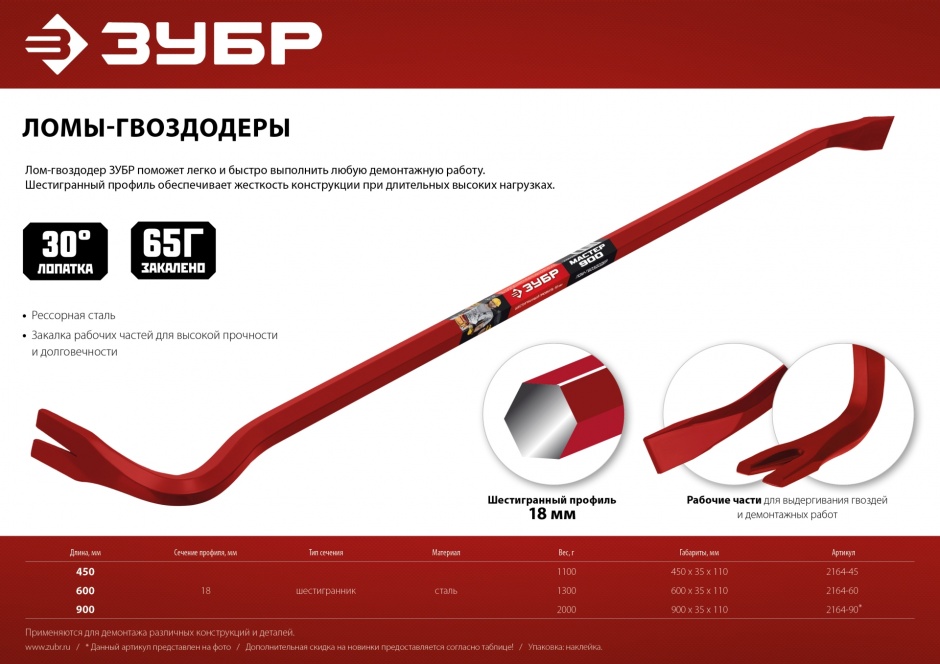 Профессиональный инструмент для демонтажных работ «ЗУБР» выдерживает длительные высокие нагрузки, обладает высоким ресурсом, имеет длительный срок службы и обеспечивает качественную работу.