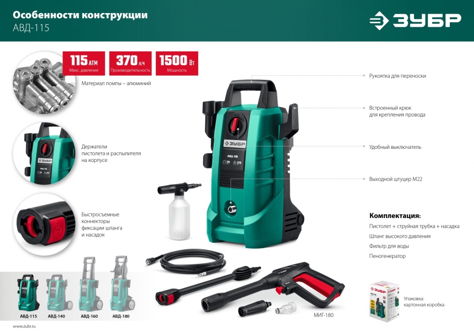 - Высокая мощность выходной струи для эффективной мойки
