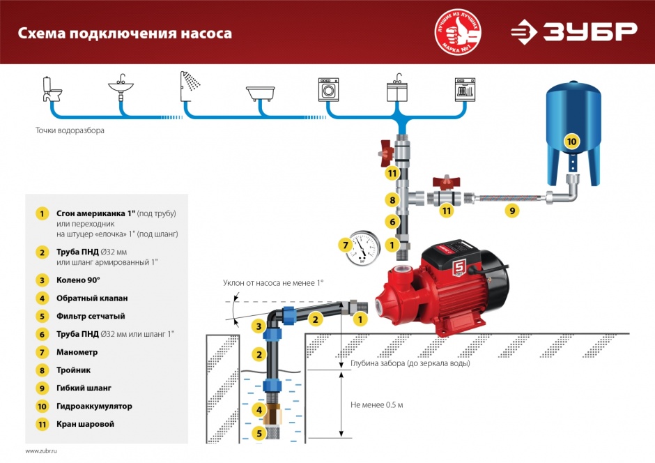 - Может стать основой насосной станции (при комплектации баком и выключателем давления)