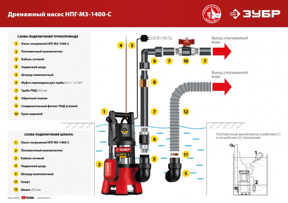 - Поплавковый выключатель обеспечивает автоматическое вкл/выкл при изменении уровня воды