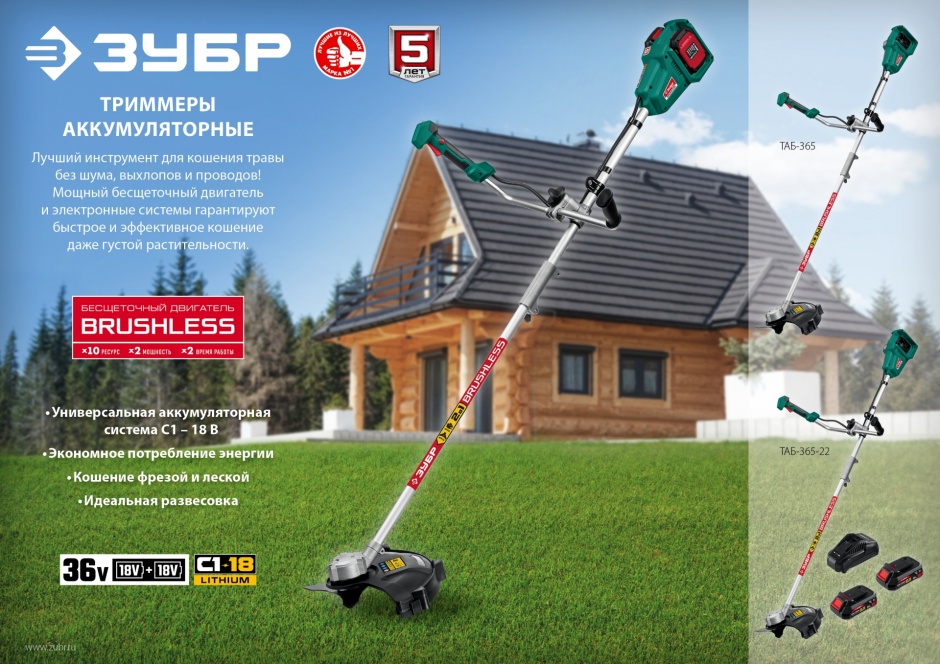 Универсальный инструмент на участке, способный заменить газонокосилку и триммер. Оснащается катушкой с леской (для мягкой растительности) и ножом (для грубой растительности). Большая мощность двигателя BRUSHLESS и две батареи позволяют косить довольно густую и грубую растительность длительное время