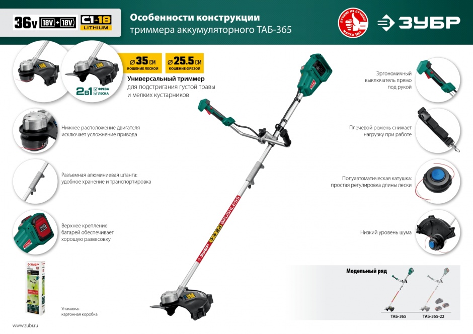 - Возможность установки двух видов режущего инструмента - лески и ножа - делают изделие универсальным
