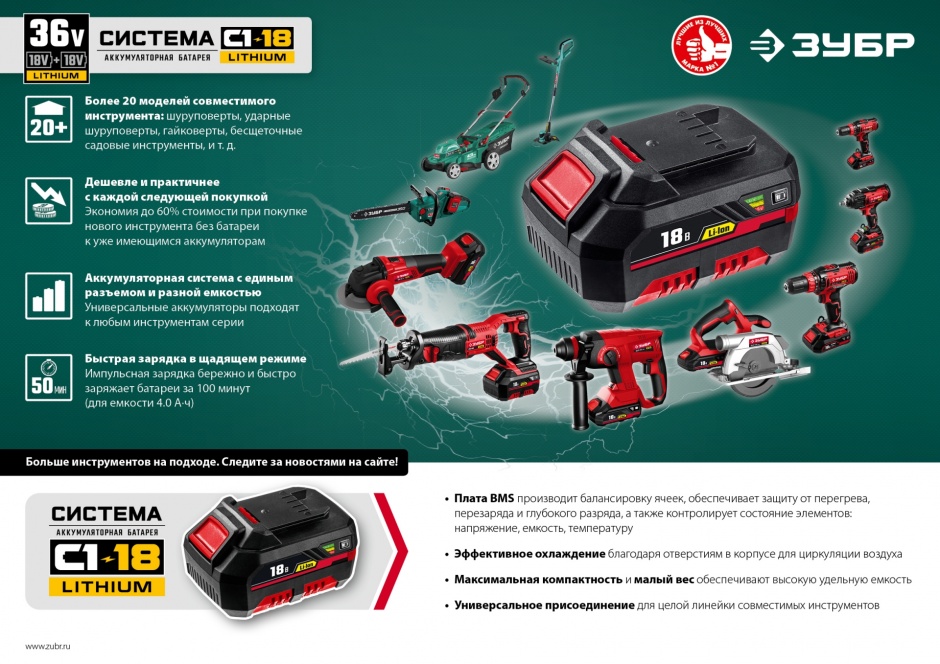- повышенная надежность ввиду отсутствия искрения, трения и контактирующих деталей - Аккумуляторная система С1-18В для большей эффективности: