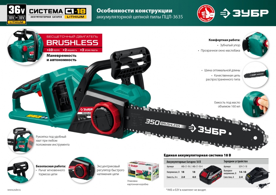 - Мощный двигатель напряжением 36 В ускоряет процесс пиления, а шина длиной 350 мм позволяет справляться с большинством веток