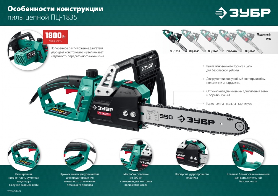 - Шина длиной 350 мм позволяет распиливать заготовки большого диаметра