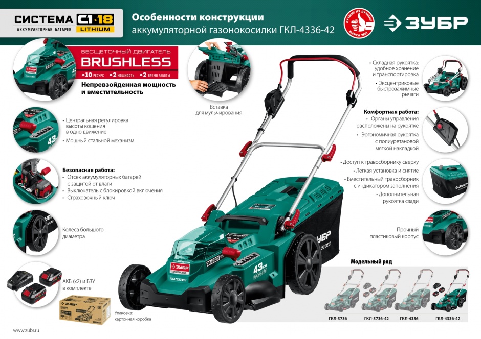 - Мощный двигатель напряжением 36 В ускоряет процесс обработки, а увеличенная ширина 43 см кошения ускоряют работу