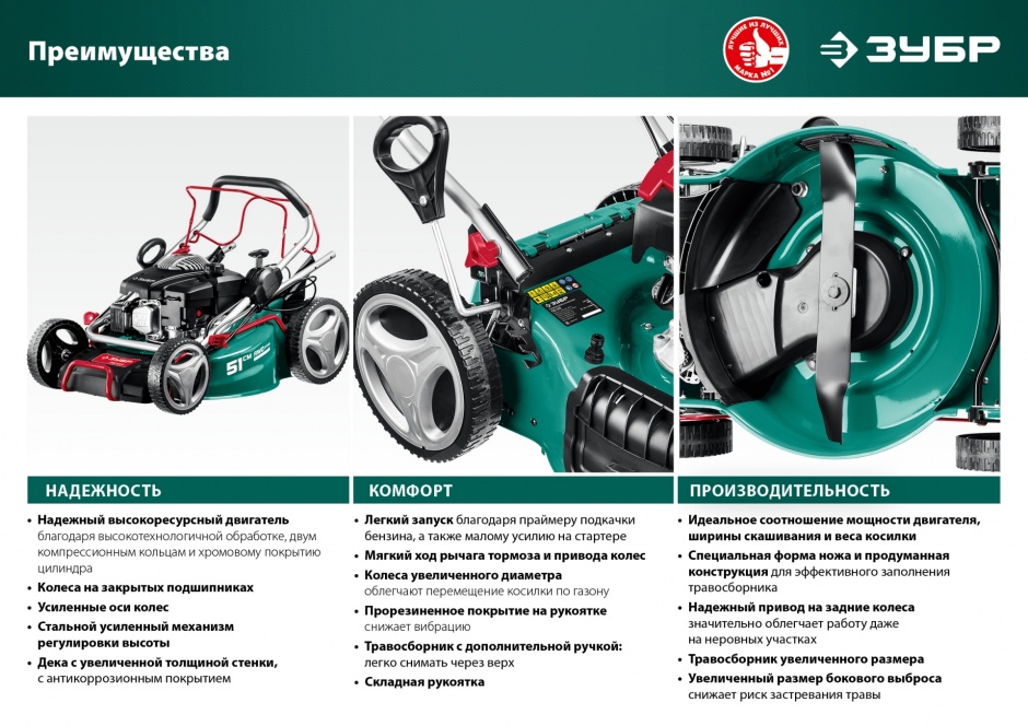 - Сбалансированные характеристики мощности двигателя и ширины кошения ускоряют процесс обработки и снижают нагрузку, чем увеличивают ресурс изделия