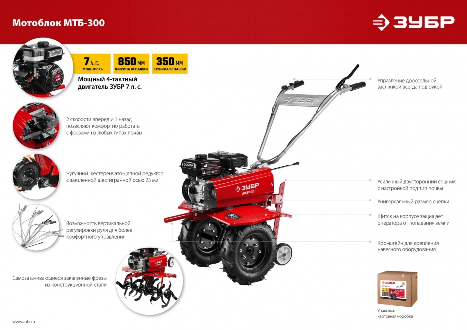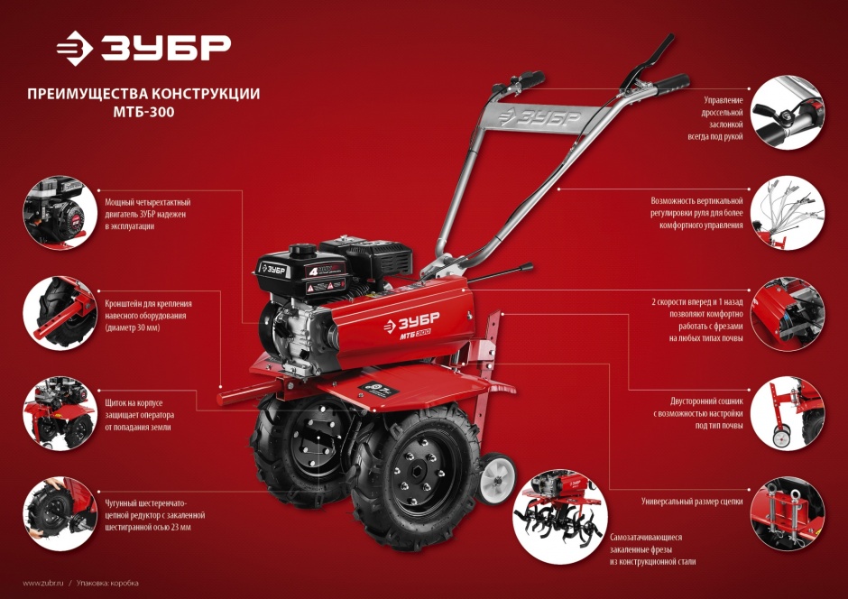 - 2 скорости вперед (основная и повышающая) и 1 назад позволяют комфортно работать на любых типах почвы