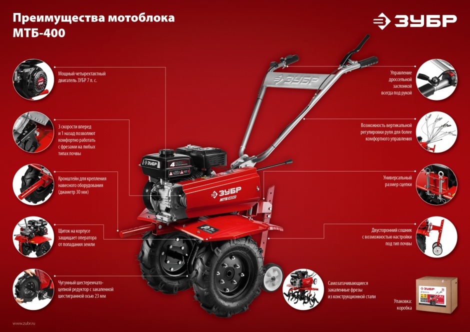 Брал себе на участок под Вологдой. Выбирал между этим и МТБ-300. Модельки похожие и по цене разнятся не сильно. Сделал выбор в пользу 400-го из-за наличия пониженной передачи. Мотоблок отличный, бегает шустро даже на обкатке, очень плавно работает переключение скоростей, вообще не требует усилий. В общем выбором очень доволен. Также хочу поблагодарить магазин за быструю и качественную работу, помогли определиться, думал заказать как обычно через СДЭК или ПЭК посоветовали транспортную кампанию DPD, и вот уже через день заказ у меня. В общем спасибо! МТБ-400 берите смело - агрекат качественный!