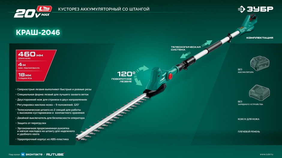 - Телескопическая штанга обеспечивает максимальную высоту реза до 4 м, что позволяет легко обрабатывать высокие растения без использования стремянки
