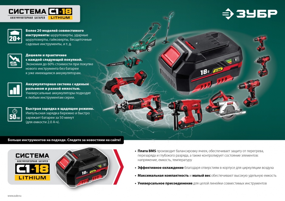- Единая аккумуляторная система С1-18В для множества инструментов